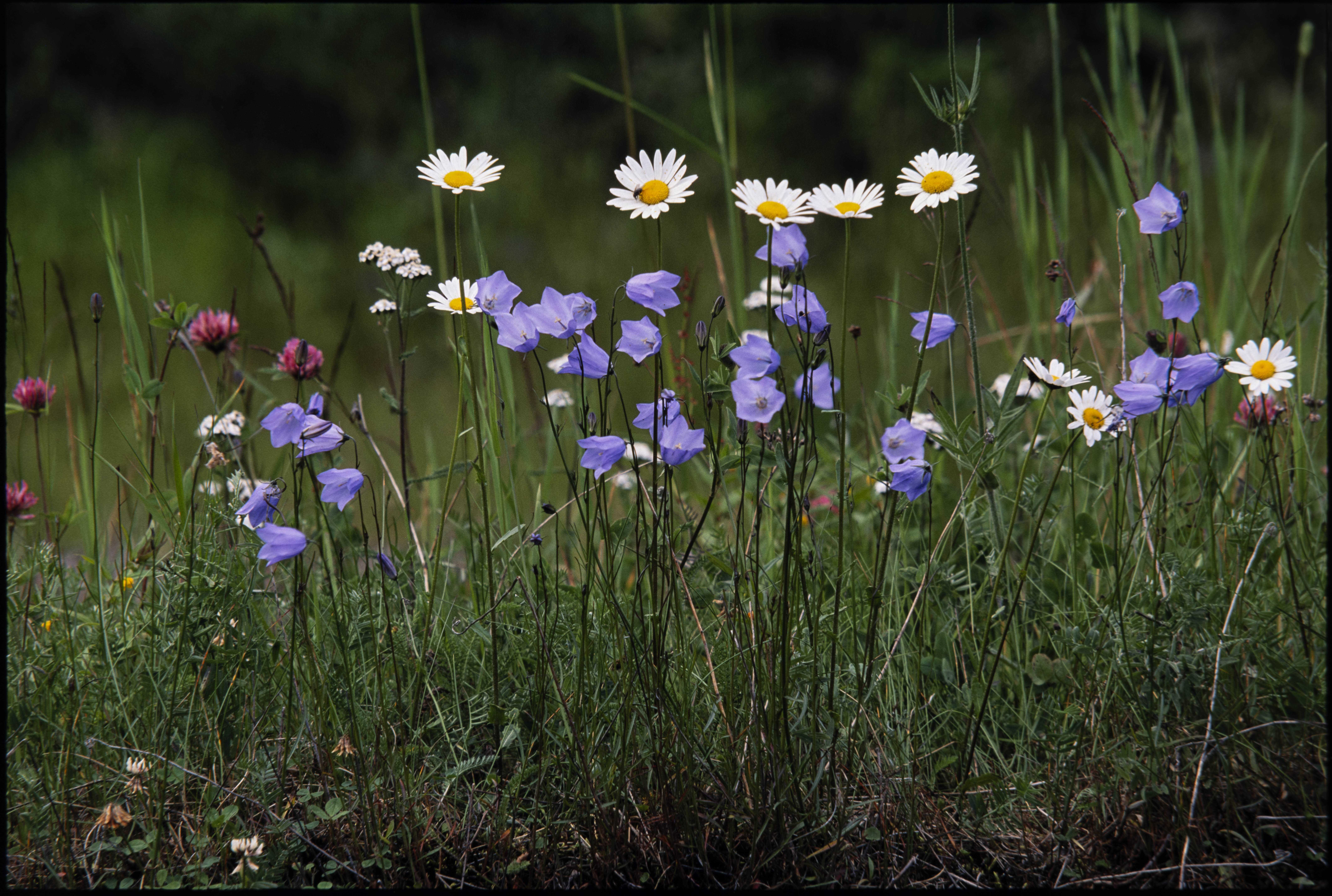 Prestekrage. I eng med blåklokke, rødkløver, vanlig ryllik