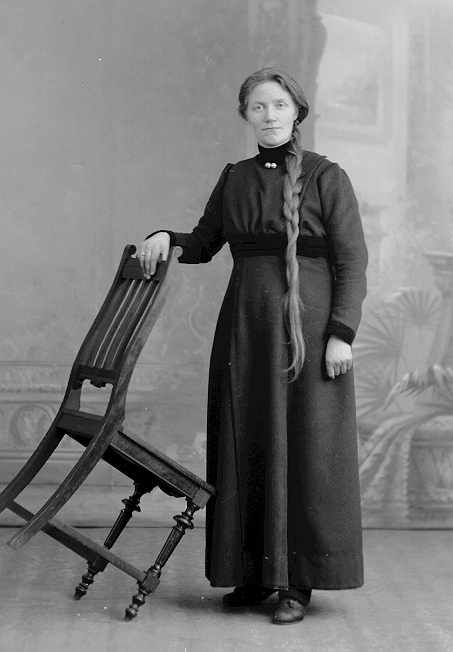 Kvinne med lang flette som støtter seg til en stolsom er vippet opp på to bein