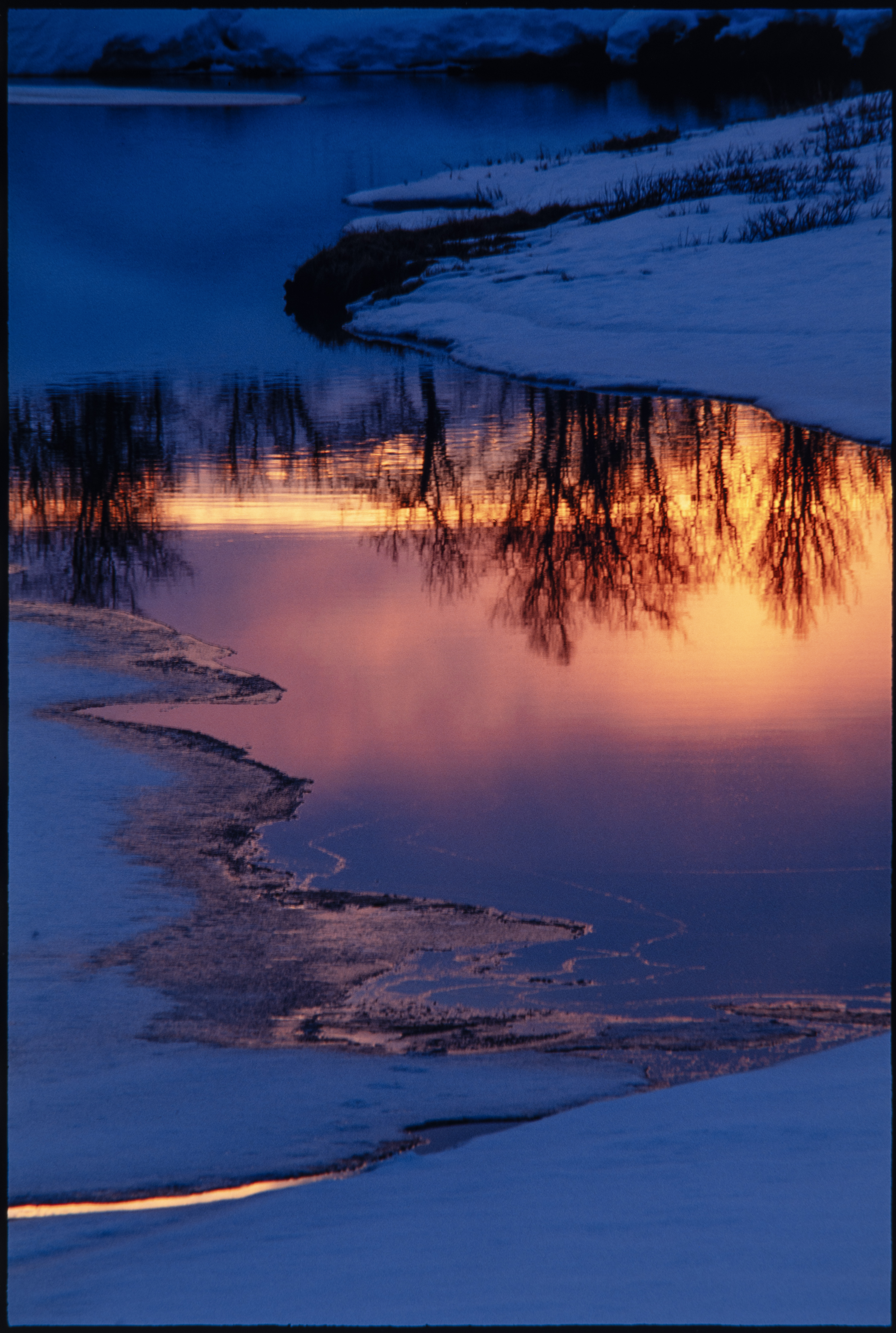 Kveldsspeiling i bekk, bjørkeskog, vinter, Tänndalen, Sverige