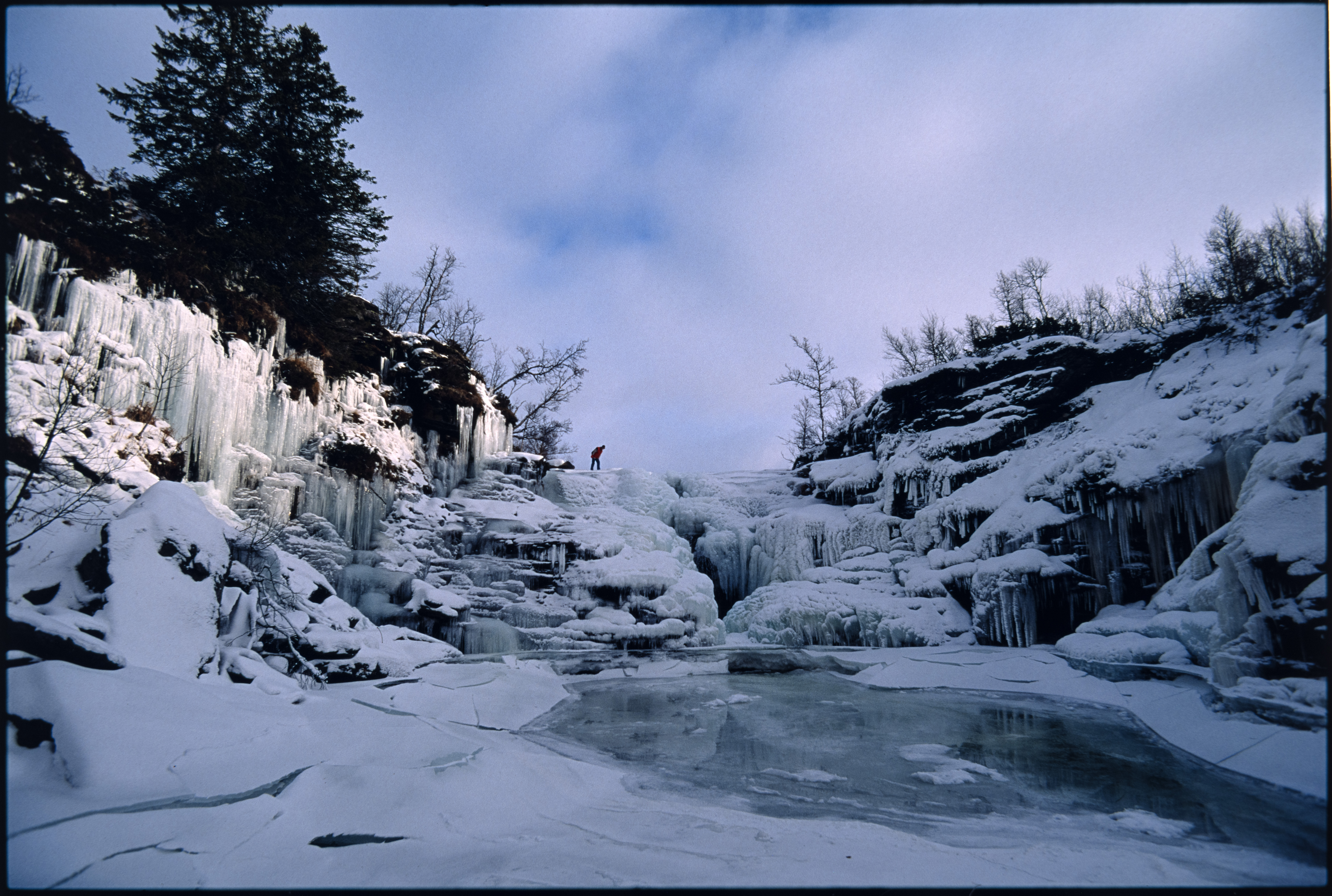 Frosset foss. Storfallet ved Gaula, Gauldalen. Borgny Hov. Holtålen. 1970-80-tallet? Vinter