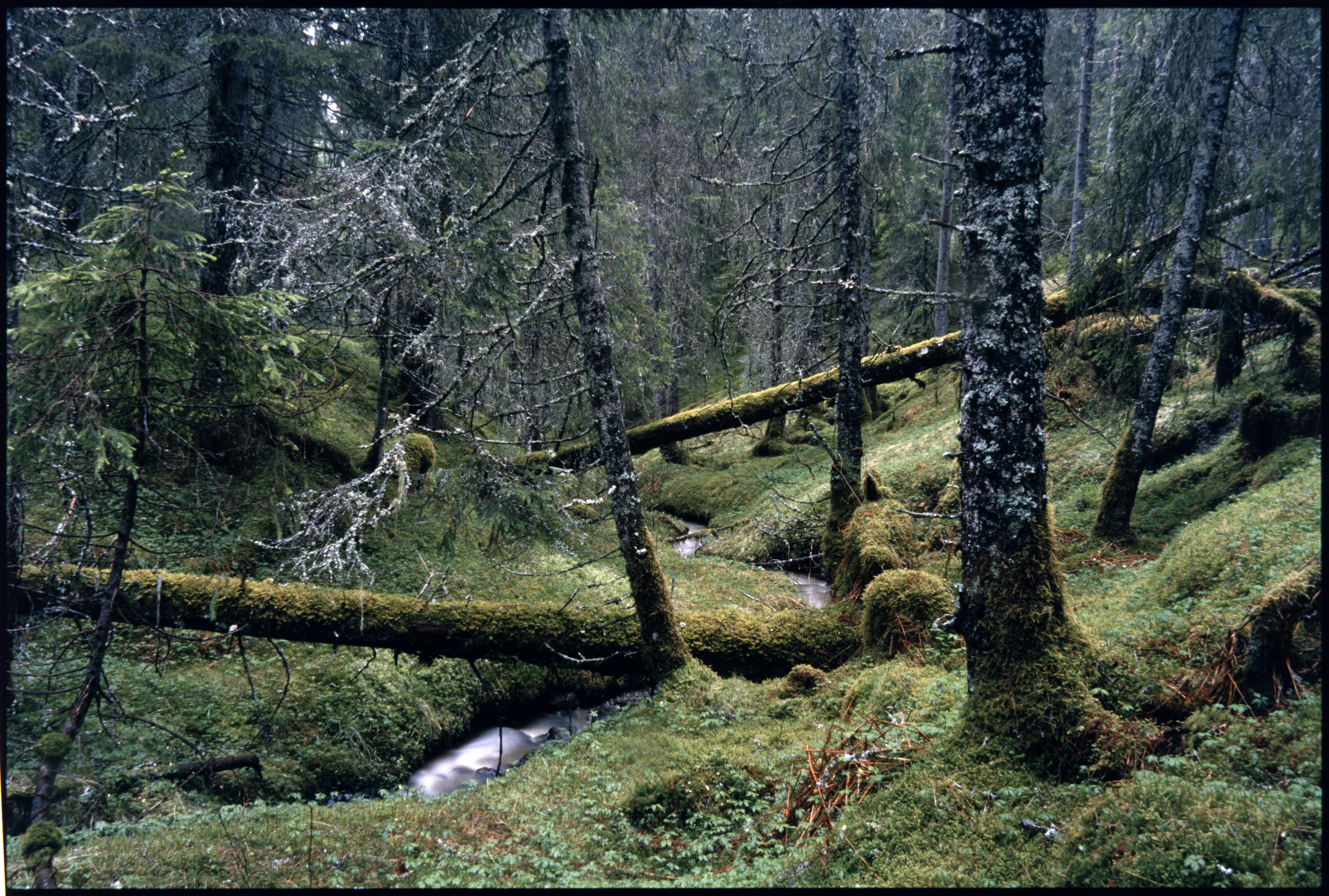 Granskog. Vindfall. Bekk. Lågurtskog med mose og blomstrende kvitveis