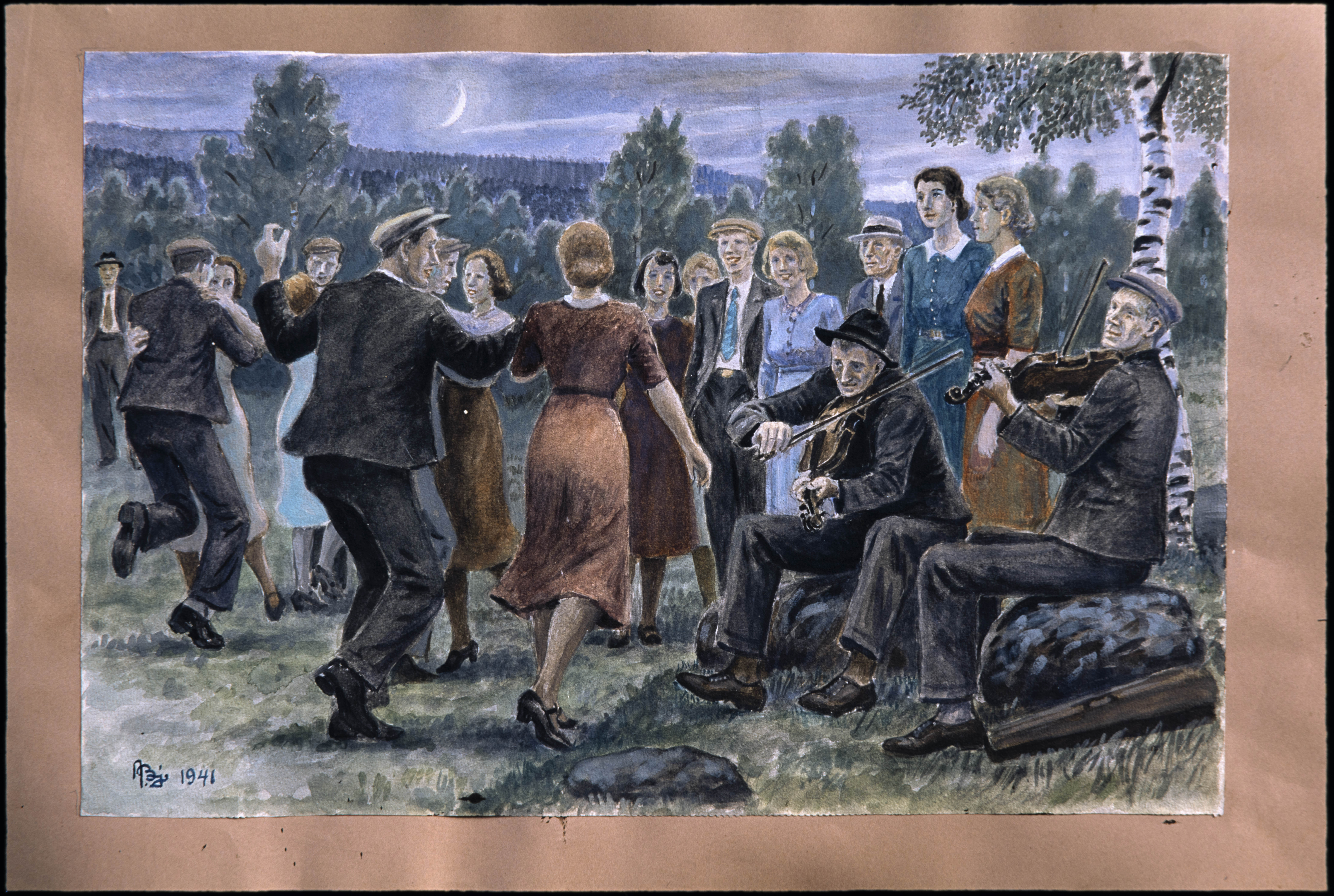 Foto av fargelagt tegning: Sommerkveld med dans på vollen i en bjørkeskog, to felespillere, nymånesigd. Tegna av Anders Bjørgaard 1941