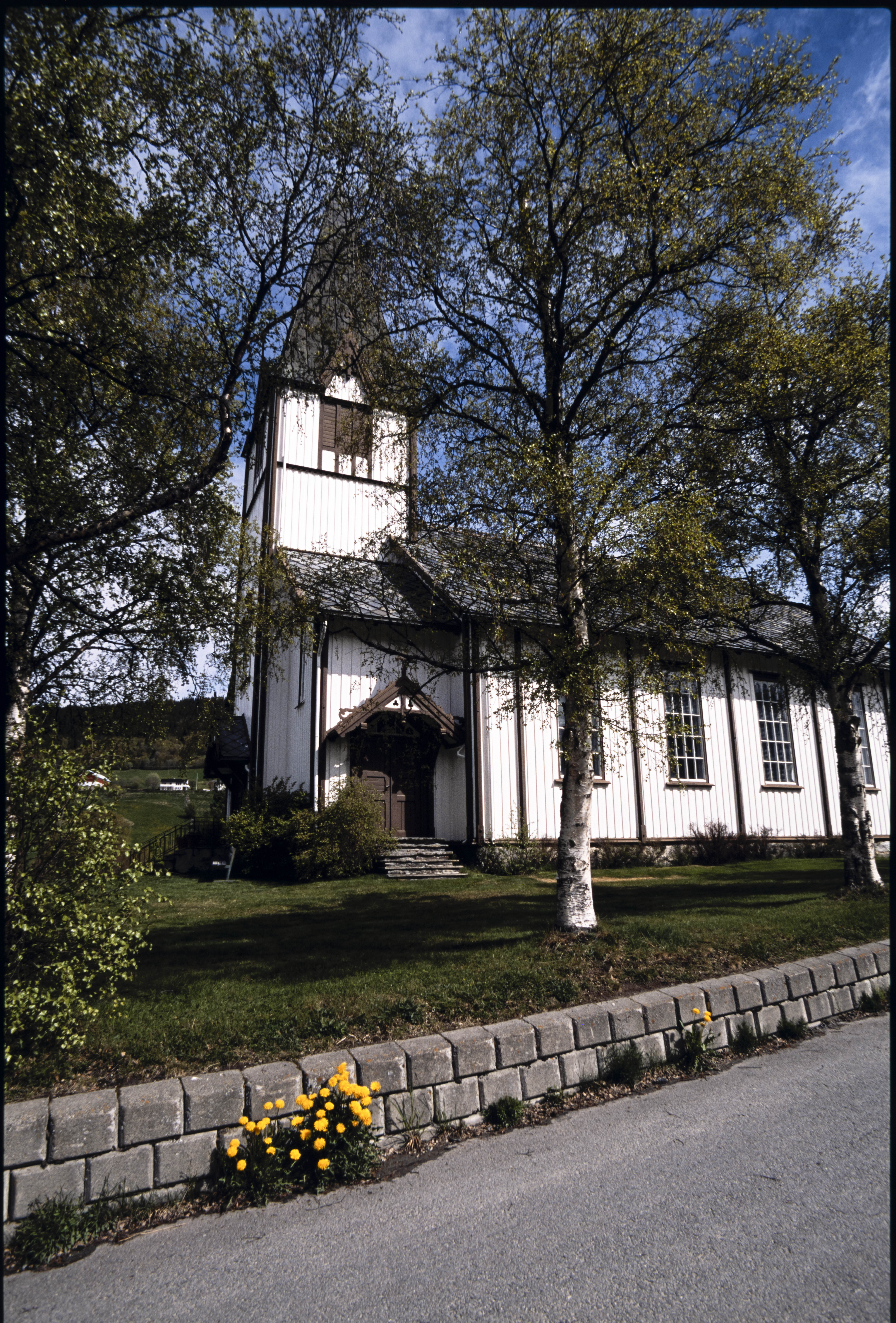 Ålen kirke, løvetann i forgrunnen. Ålen, juni