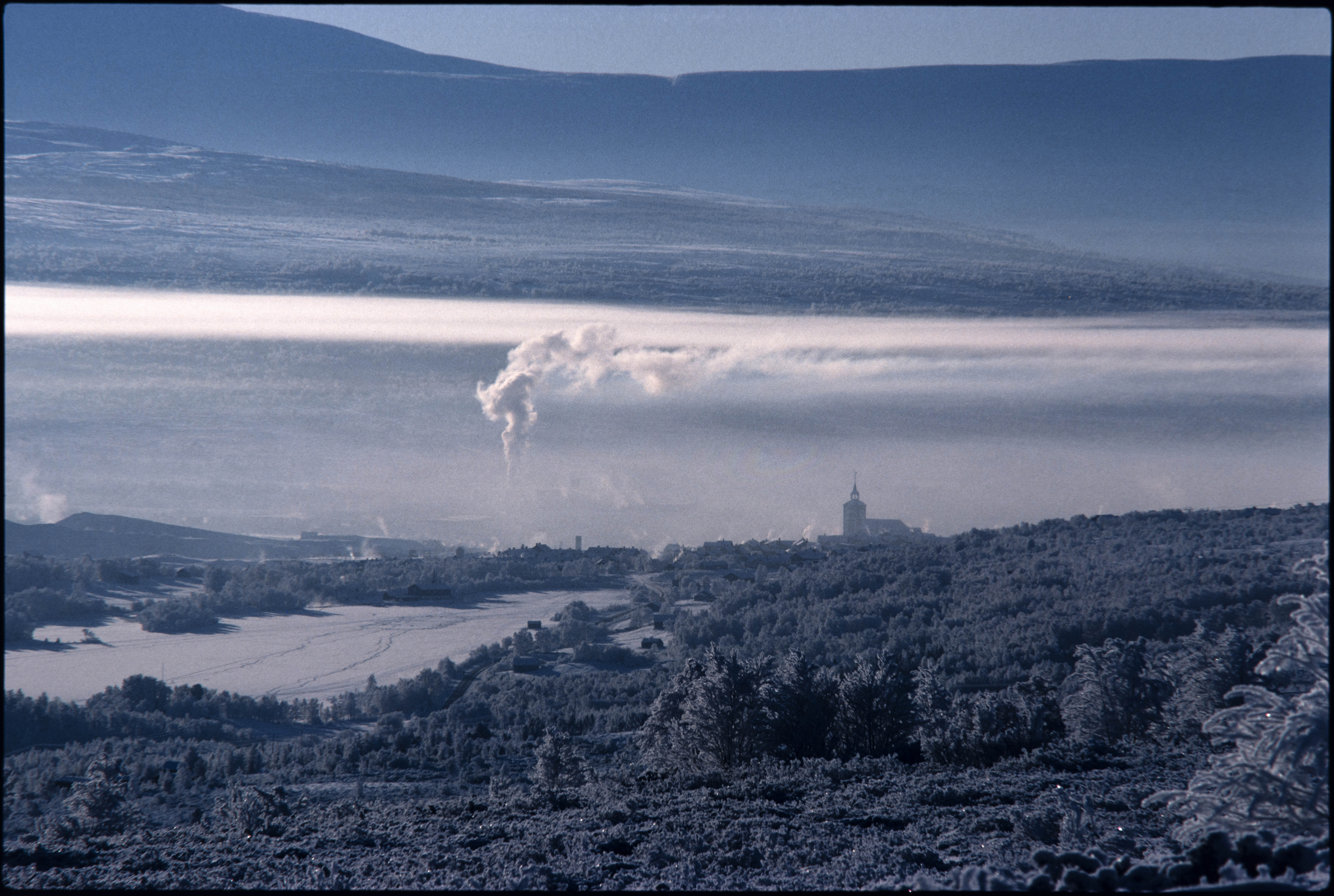 Bergstaden, en kald vinterdag. Frostrøyk, røyk fra piper. Sett fra nord ved Hittersjøen. Røros. Vinter .