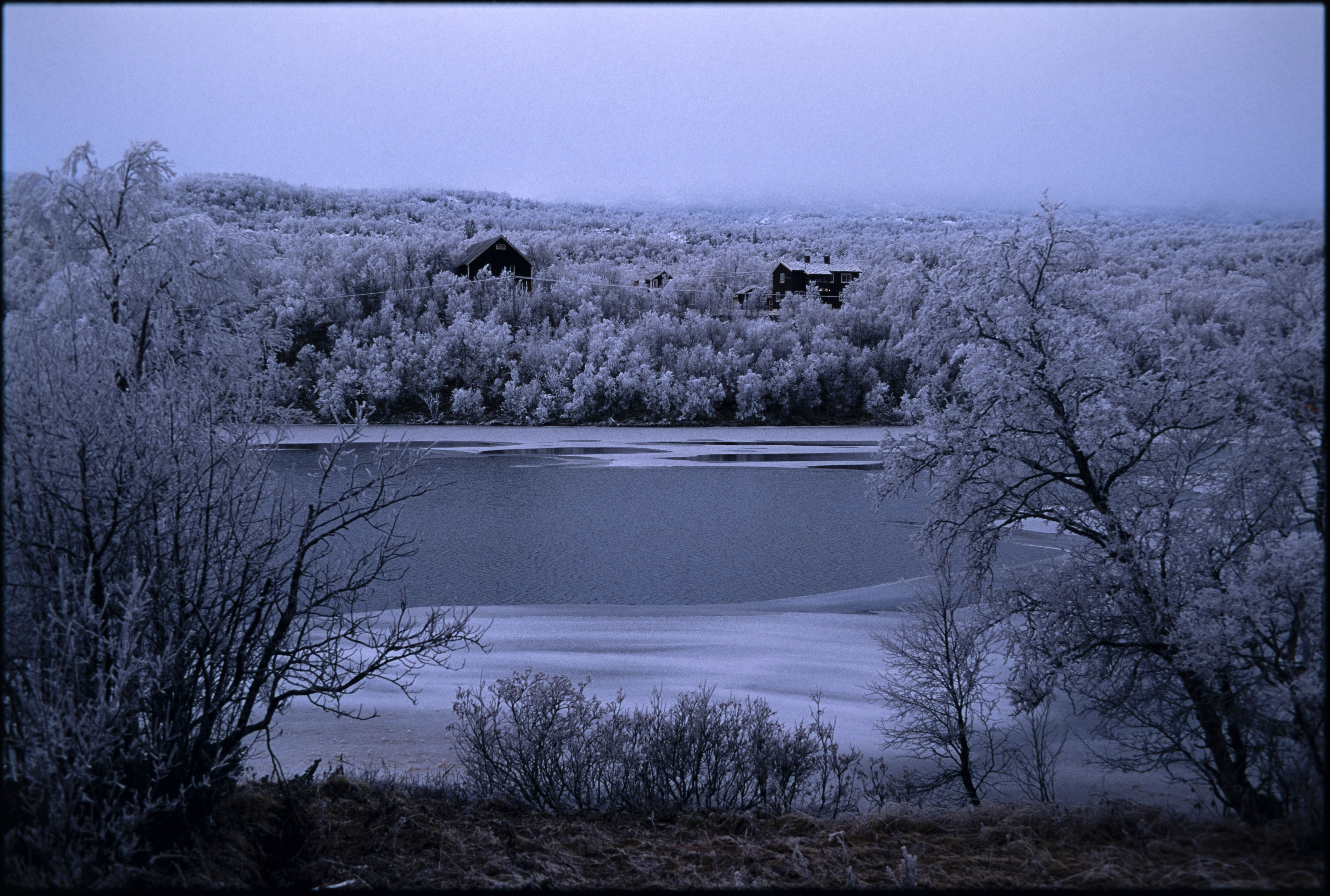 Småbruk med låve og våningshus. Vann i forgrunnen. Frost i trærne. Ved Glomma? Røros. Vinter