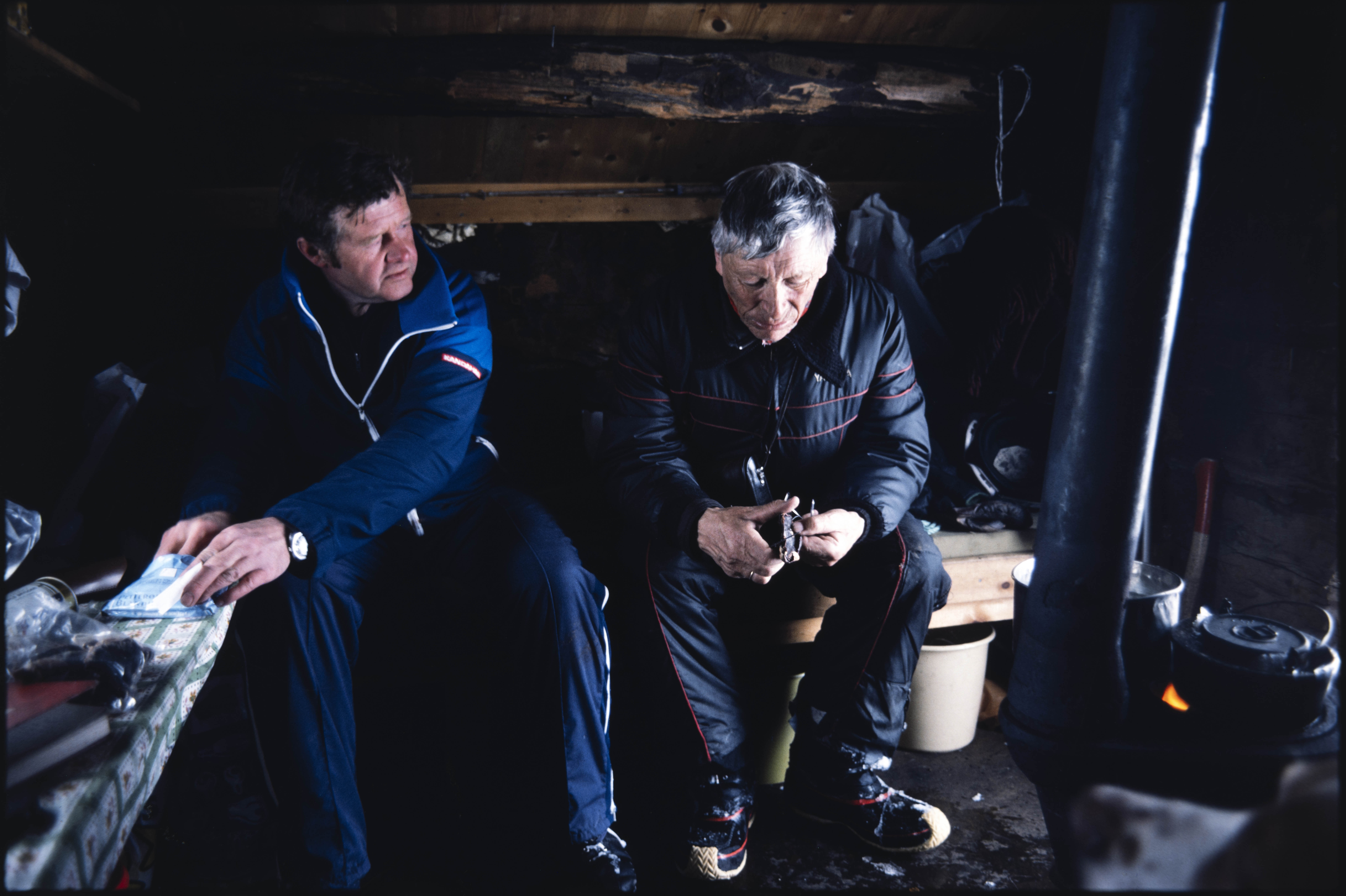 Femundsmarka. To karer har kvil med spekekjøtt og rullings i tømmerbu.