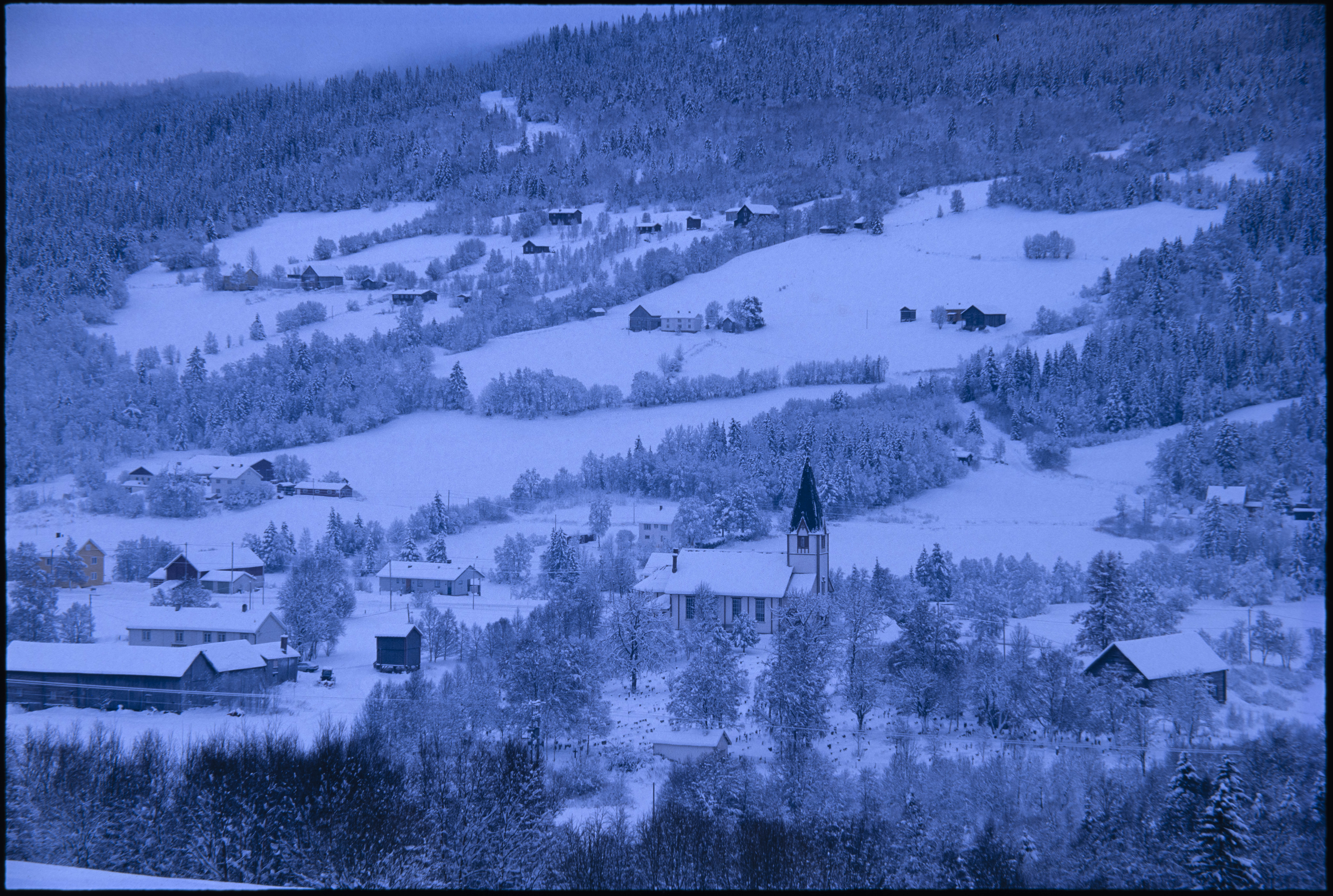 Hovsletta og kirka med Egga i bakgrunnen. Sett fra Løberg. Ålen. Vinter