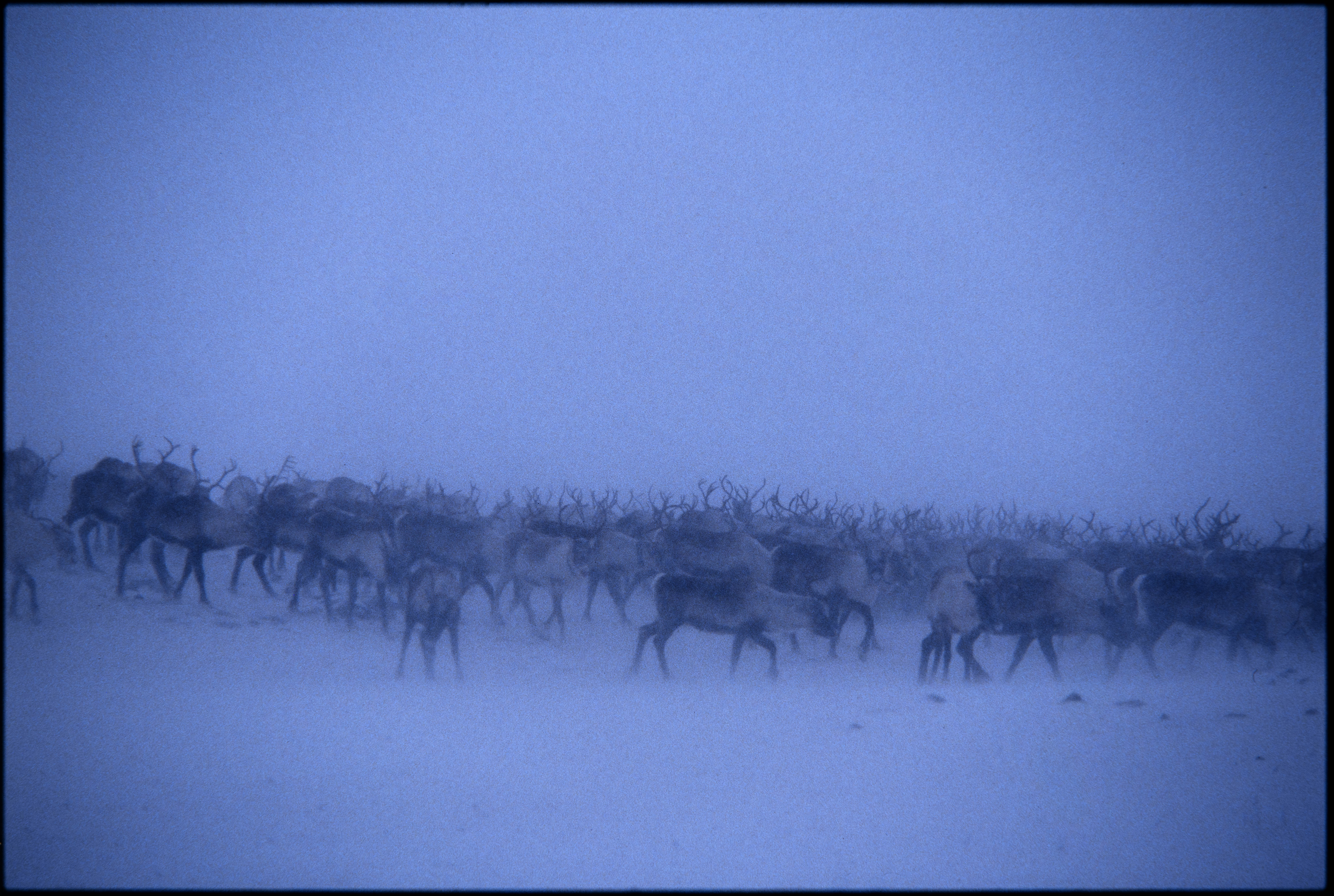 Tamreindrift. Reinflokk i snøfokk. Vinter