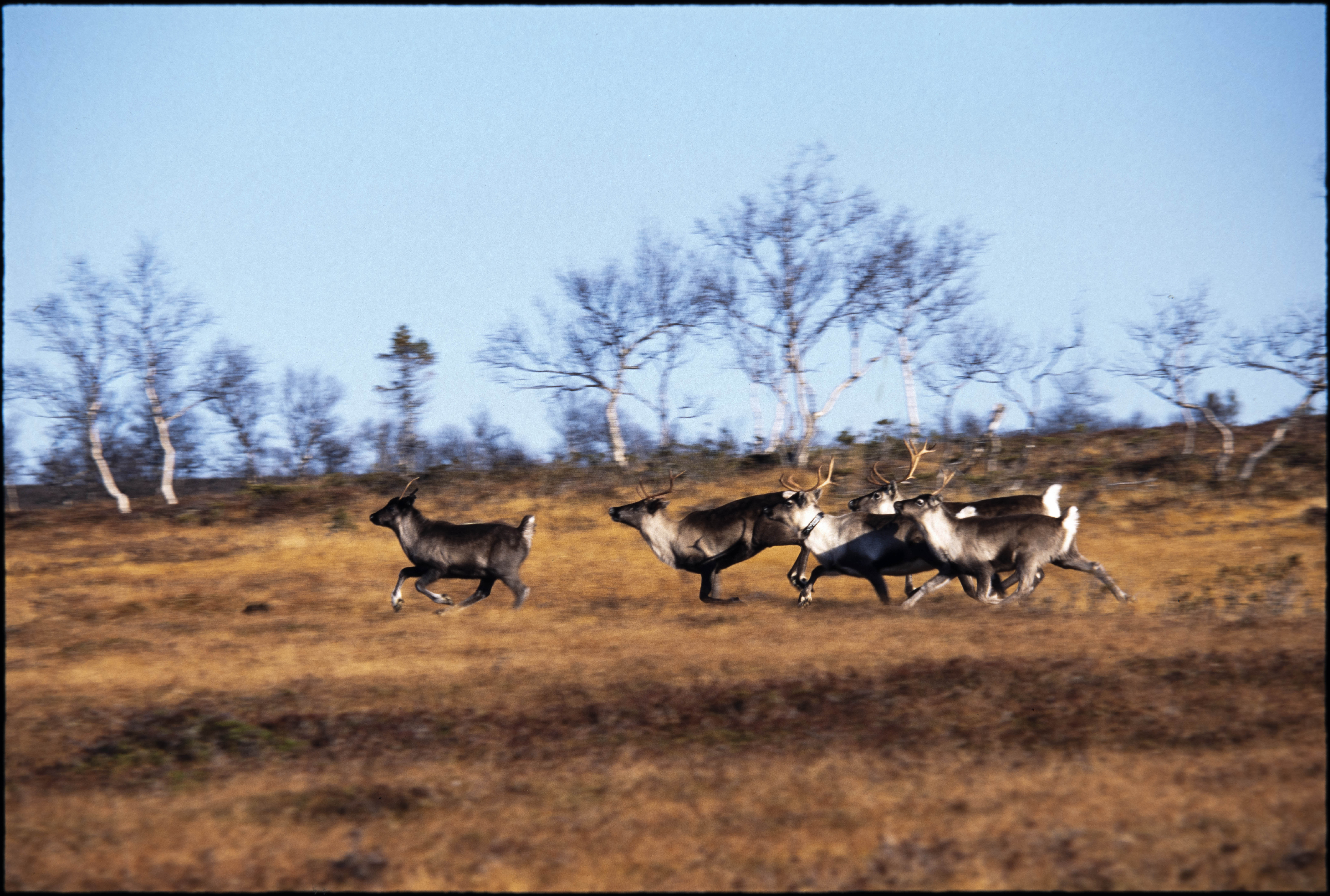 Tamreindrift. Liten flokk i flukt. Høst