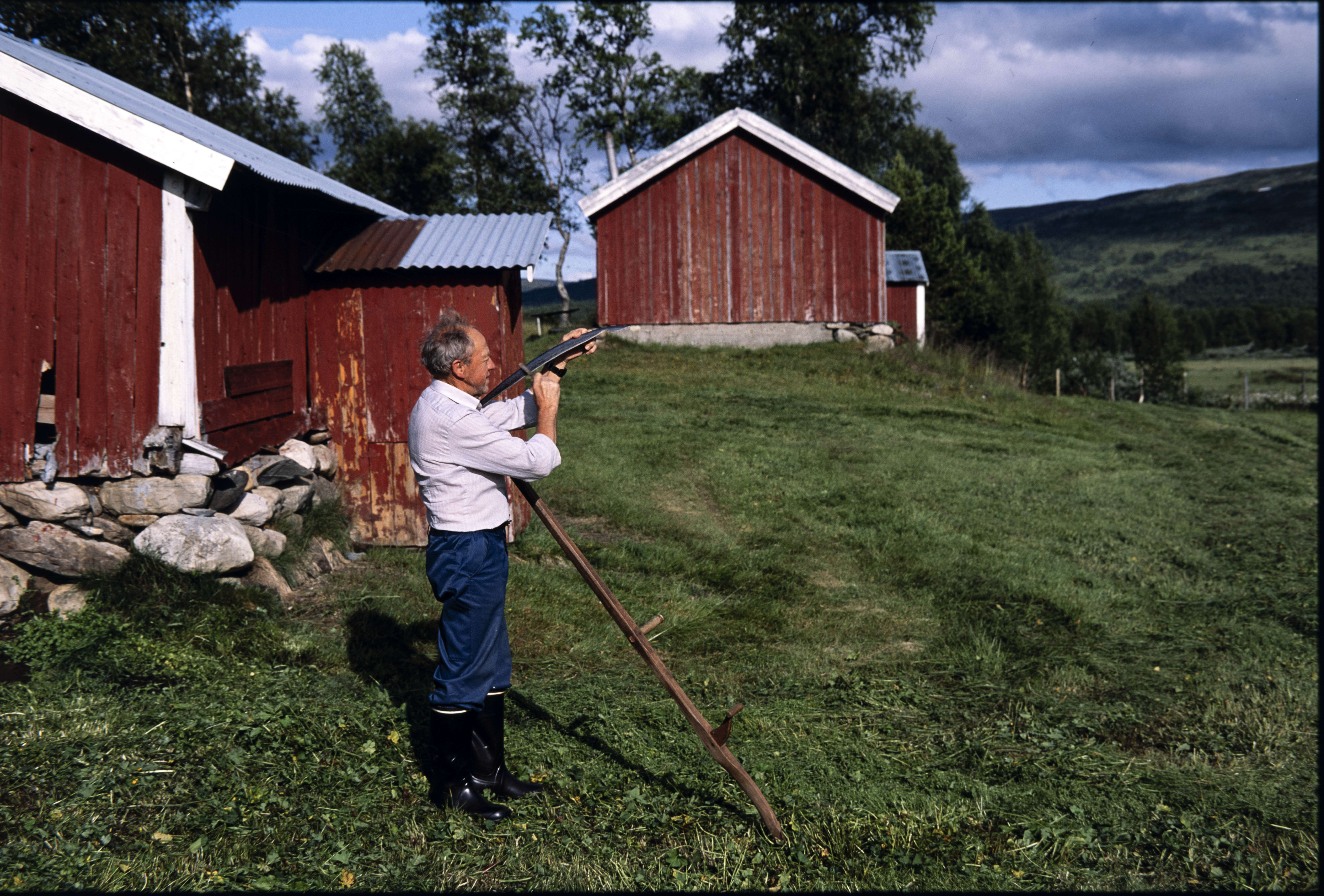 Sliping av ljå ved setervoll. Holtålen