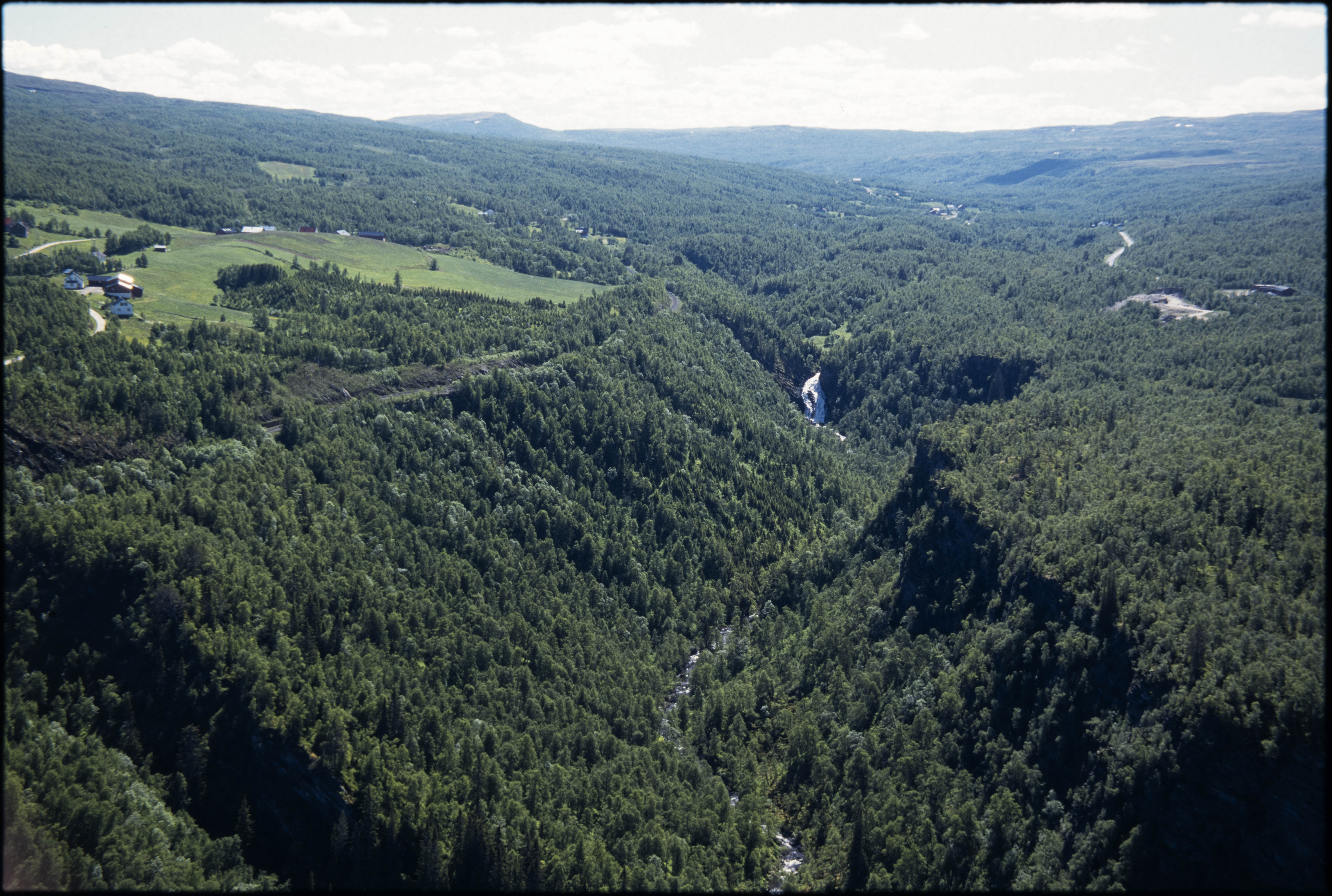 Ruglråen med fossen. Fra helikopter ved NRK-opptak til Ut i naturen ("Juvets hage" ved Einar Gjærdevold). Med J. Ø. Hov og Trond Arnesen. Juli 1996