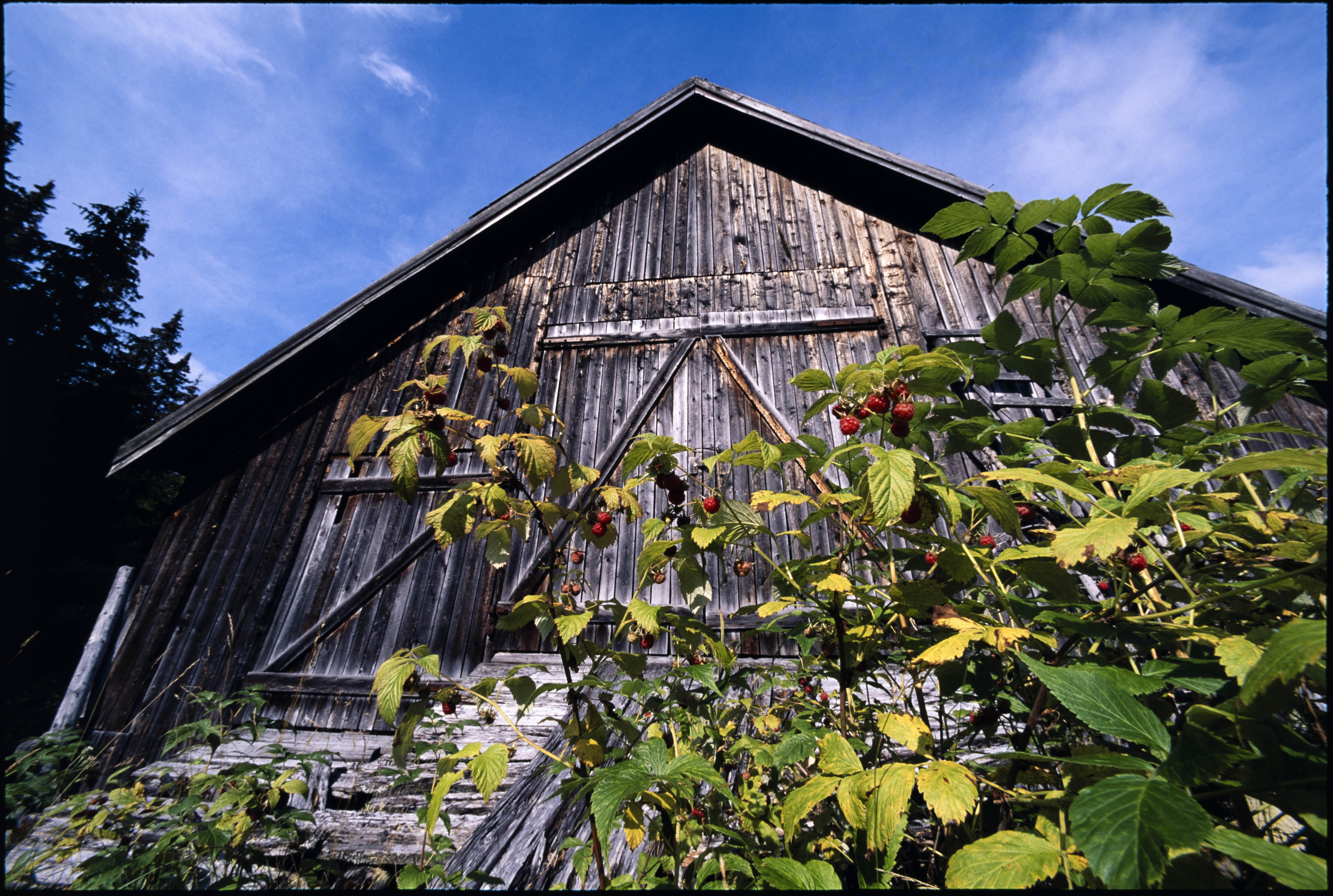 Låvevegg og låvebru. Bringebær i forgrunnen