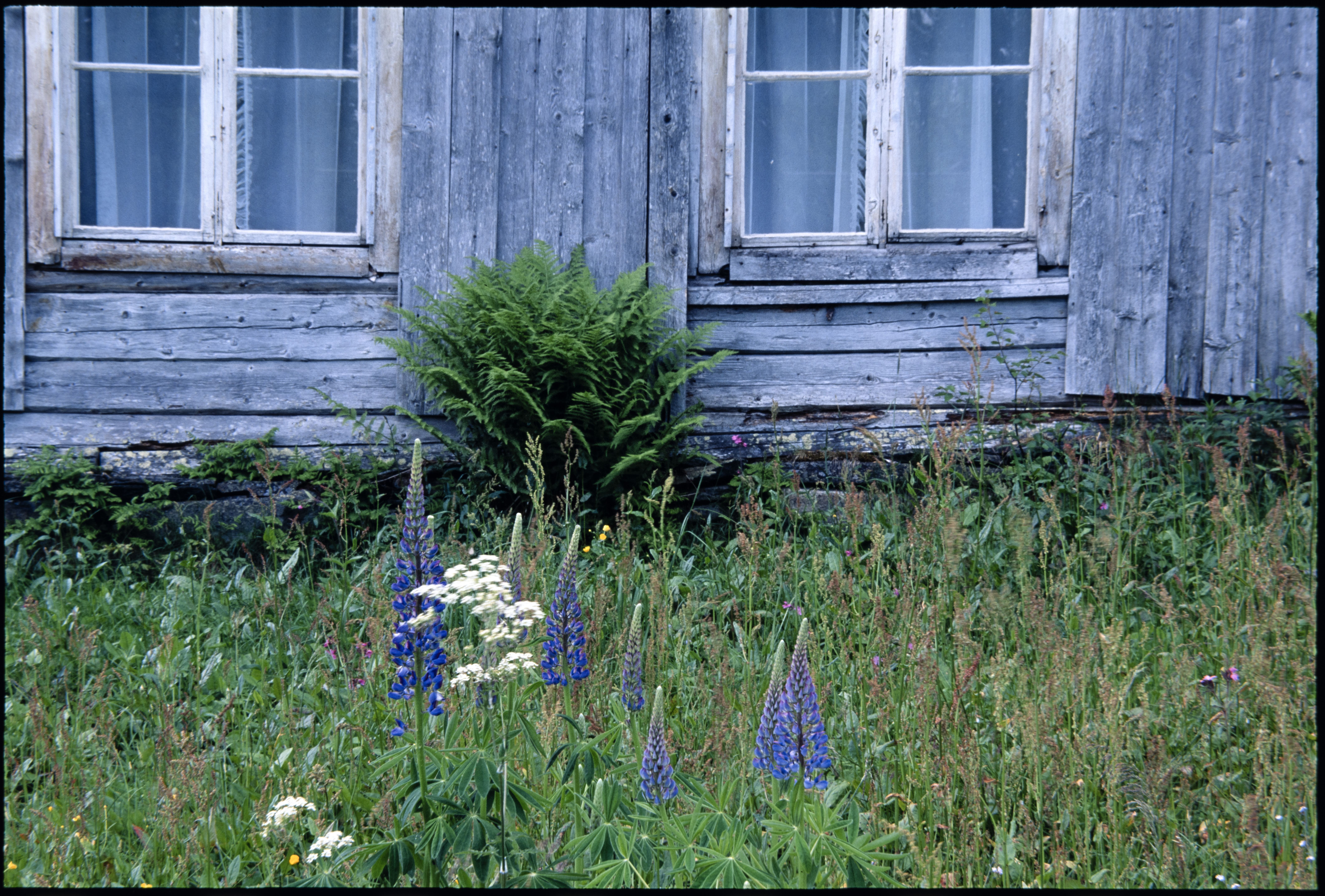 Vegg, værbitt, våningshus. Eng med skogburkne, hundekjeks, lupin, engsyre,rød jonsokblom