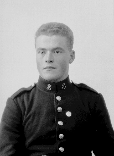Mann i mørk uniform med en S på hver side av kraven, halvfigur