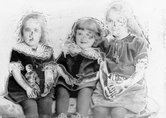 Tre små barn i mørke kjoler med hvite blondekraver sitter, det ene barnet holder en dukke, helfigur