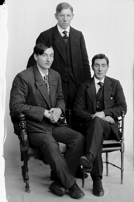 Tre menn i mørke dresser, hvite skjorter og slips, en av dem står, foran ham sitter de to andre i hver sin stol, helfigur