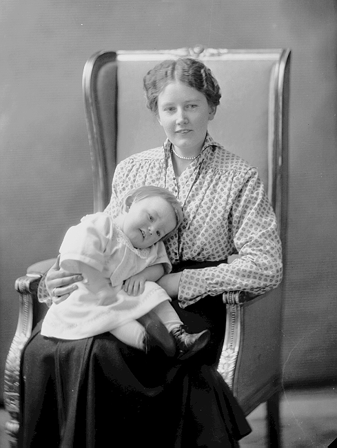 Kvinne i mønstret bluse og mørkt skjørt, sittende på stol, lite barn i fanget, helfigur