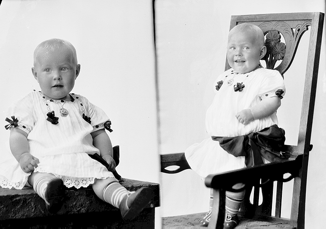 Liten jente, lys kjole, sittende på murt steinoppsats, stående på stol, helfigur
