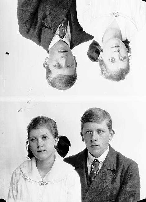 Jente, lys kjole, stor mørk hårsløyfe, ung mann, mørk dress, halvfigur
