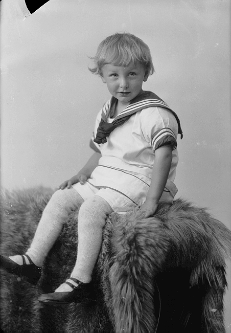 Gutt, lys matrosdress, sittende på skinnfell, helfigur