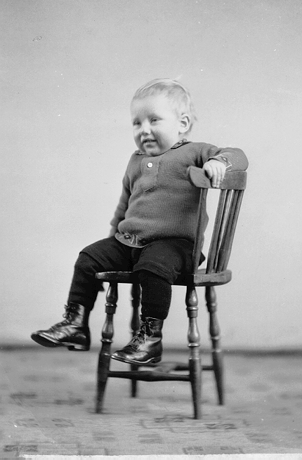 Liten gutt, lys kofte med pyntebånd, sittende på stol, helfigur