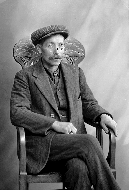 Mann, bart, mørk stripete dress, sixpence, sittende på stol, halvfigur