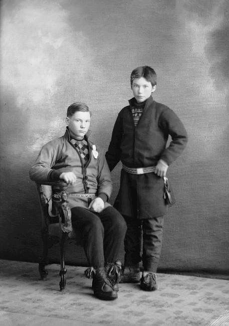 To gutter, lys drakt, sittende på stol, mørk drakt, stående, helfigur