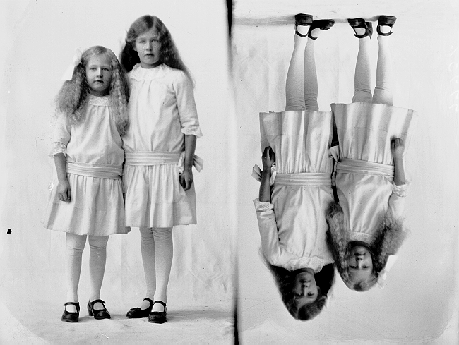 To jenter, søstre, lyse identiske kjoler, stående, helfigur