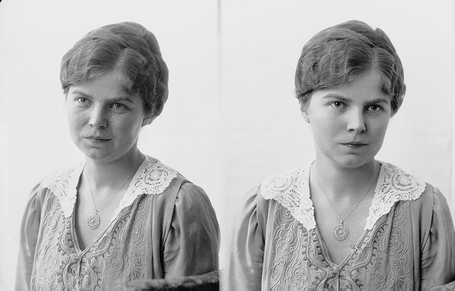 Kvinne, mørk mønstret kjole med lys krage, halvfigur