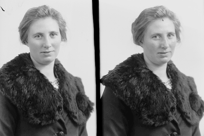 Kvinne, mørk kåpe med pelskrage, halvfigur