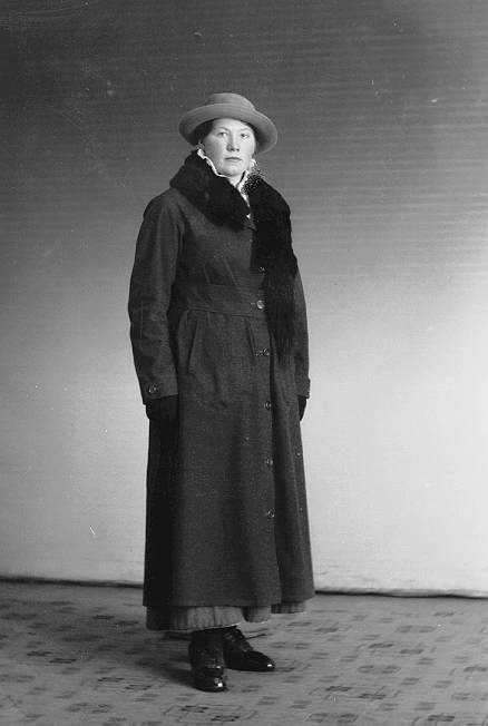Kvinne, mørk kåpe med revekrage, mørk hatt, stående, helfigur
