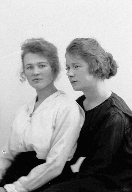 To kvinner, 1, lys bluse, mørkt skjørt, 2, mørk bluse og skjørt, begge sittende, halvfigur