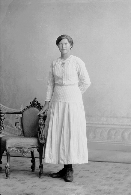 Kvinne, lys kjole, stående ved stol, helfigur