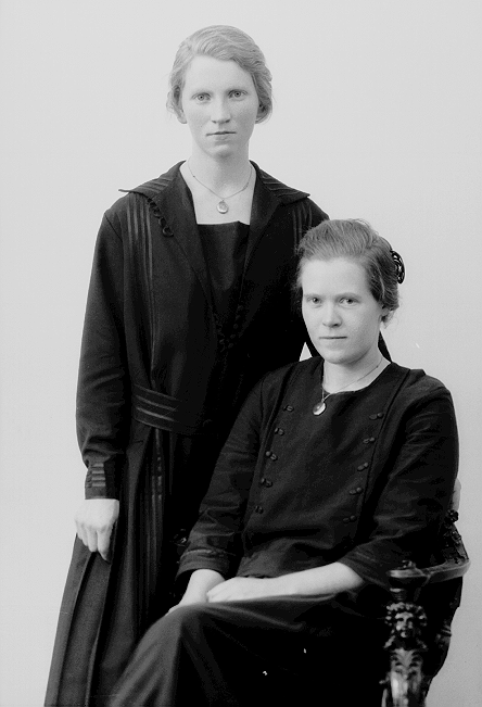 To kvinner, mørke kjoler, en stående, den andre sittende på en stol, begge halvfigur
