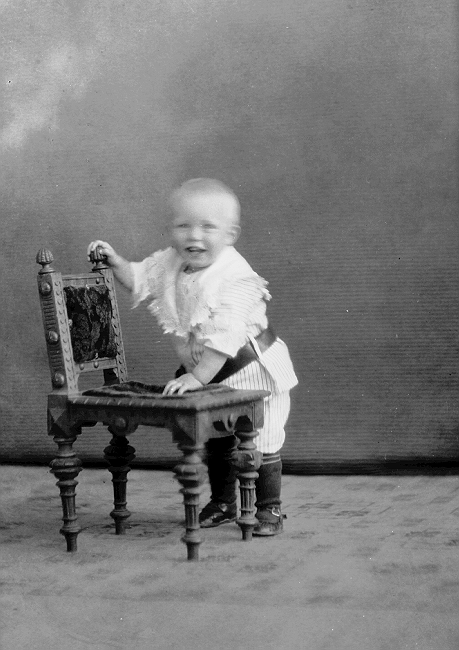 Liten gutt, lys drakt med mørkt belte, stående ved stol, helfigur