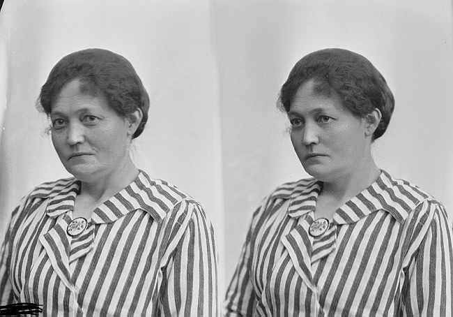 Kvinne, stripete bluse, brosje, halvfigur