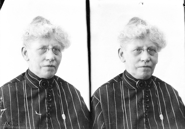 Kvinne, mørk bluse med tynne lyse striper, halvfigur