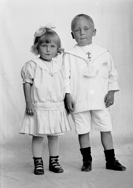 To barn, søskem, jente, lys kjole og hårsløyfe, gutt, lys matrosdress, begge stående, helfigur