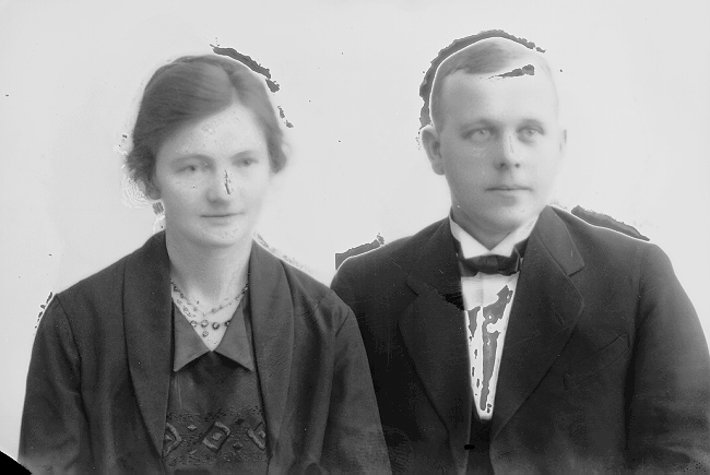 Par, kvinne, mørk bluse, mann, mørk dress, begge halvfigur