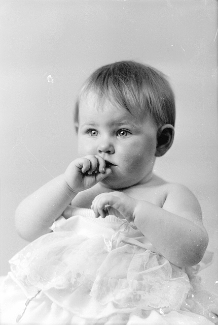 Liten jente, lys kjole dratt ned over skuldrese, halvfigur