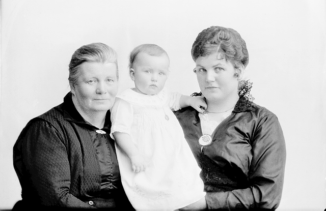 Gruppe, 1, kvinne, mørk kjole, (fru W), 2, liten jente, lys kjole, stående, (KJI), 3, kvinne, mørk kjole, (fru I), alle halvfigur
