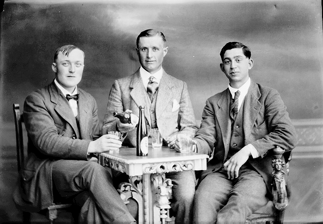 Gruppe, tre menn, mørke dresser, sittende rundt et bord, alle halvfigur, tre glass og en flaske på bordet, (EAJ i midten)