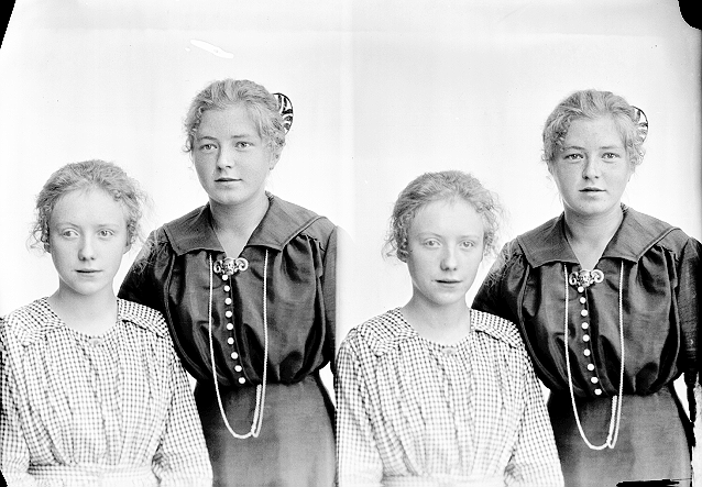 To kvinner, 1, rutete kjole, sittende, 2, lys bluse og skjørt, stående, begge halvfigur