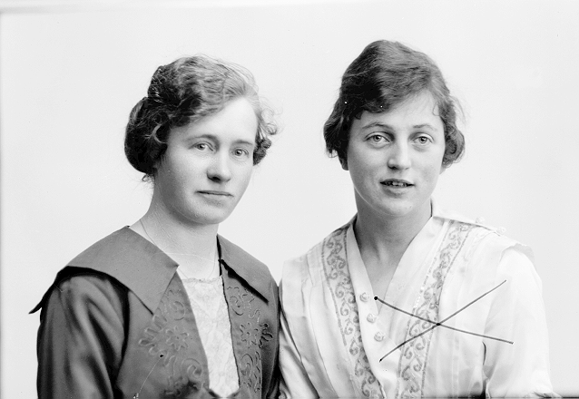 To kvinner, 1, mørk bluse, 2, lys bluse, begge halvfigur