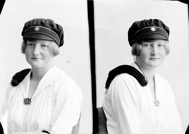 Kvinne, lys bluse, studentlue, brosje, halvfigur