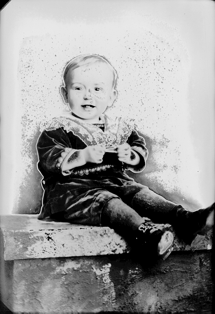 Liten gutt, mørk kjole med lys krage, sittende, halvfigur