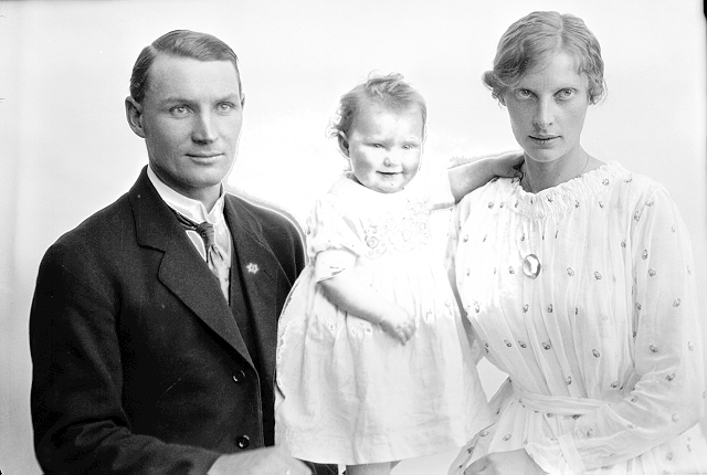 Familiegruppe, 1, mann, mørk dress, sittende, 2, liten jente, lys kjole, stående med venstre hånd på mors skulder, 3, kvinne, lys mønstret kjole, brosje, sittende, alle halvfigur