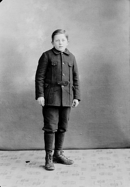 Gutt, mørk jakke og knebukser, stående, helfigur