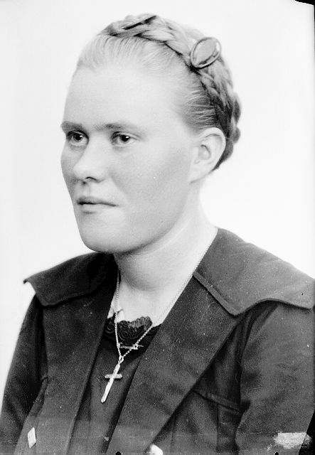 Kvinne, mørk bluse, kors i halskjede, halvfigur