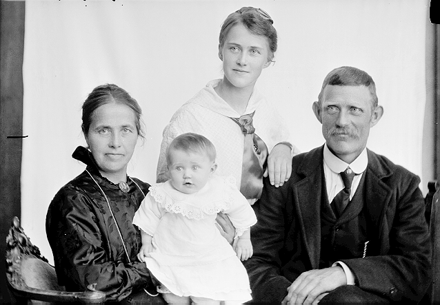 Gruppe, 1, kvinne, mørk bluse, brosje, sittende på stol, (fru OS), 2, liten jente, lys kjole, sittende på 1s fang, (SS), 3, kvinne, lys bluse, stående, (EL), 4, mann, bart, mørk dress, sittende på stol, (OS), alle halvfigur